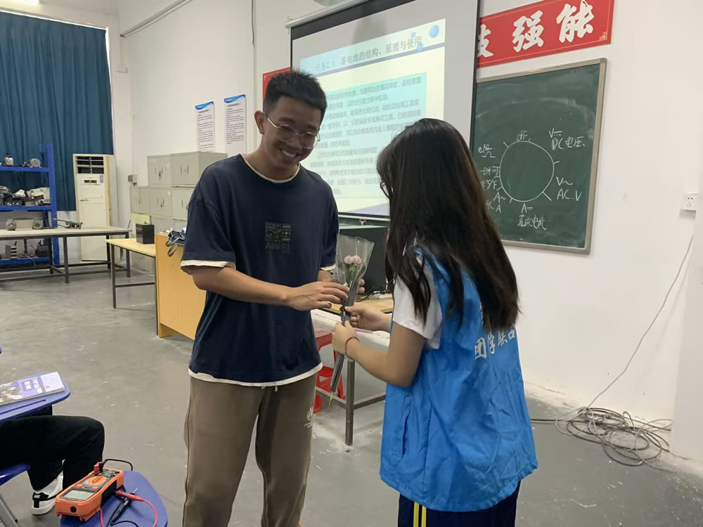 这些年轻的身影没有停留在某一个角落。从实训场地到教学楼,从办公室到校道,他们像是校园中的“芬芳信使”,把敬意与爱意精准投递。有老师感动地说:“一早推开门就看到孩子们的笑脸和鲜花,一整天的能量瞬间满格!”