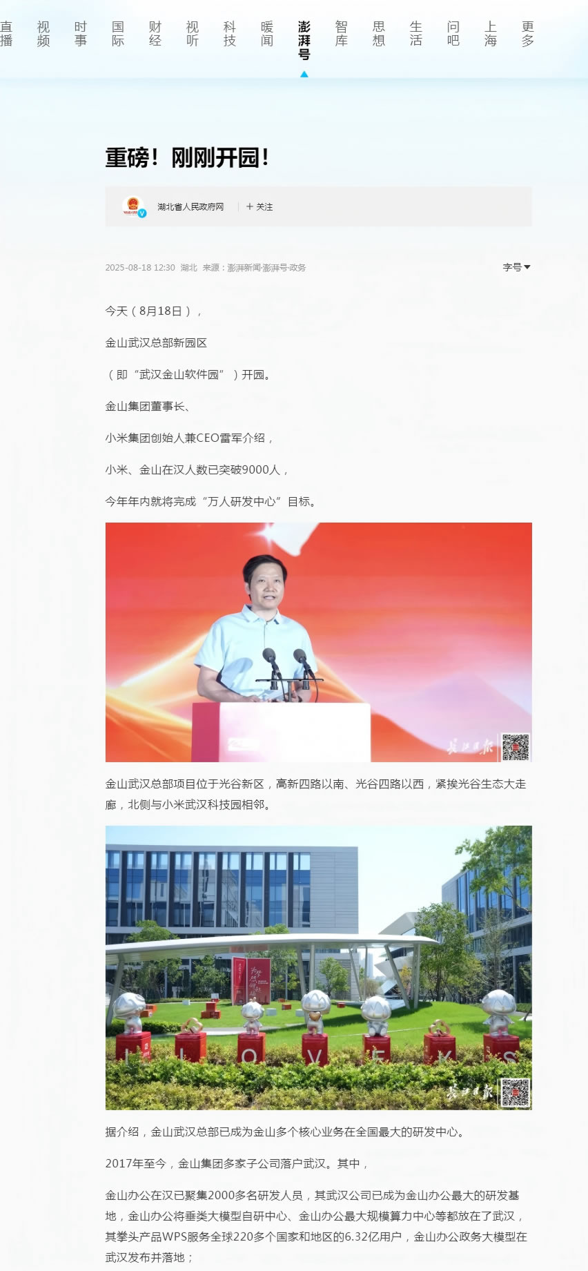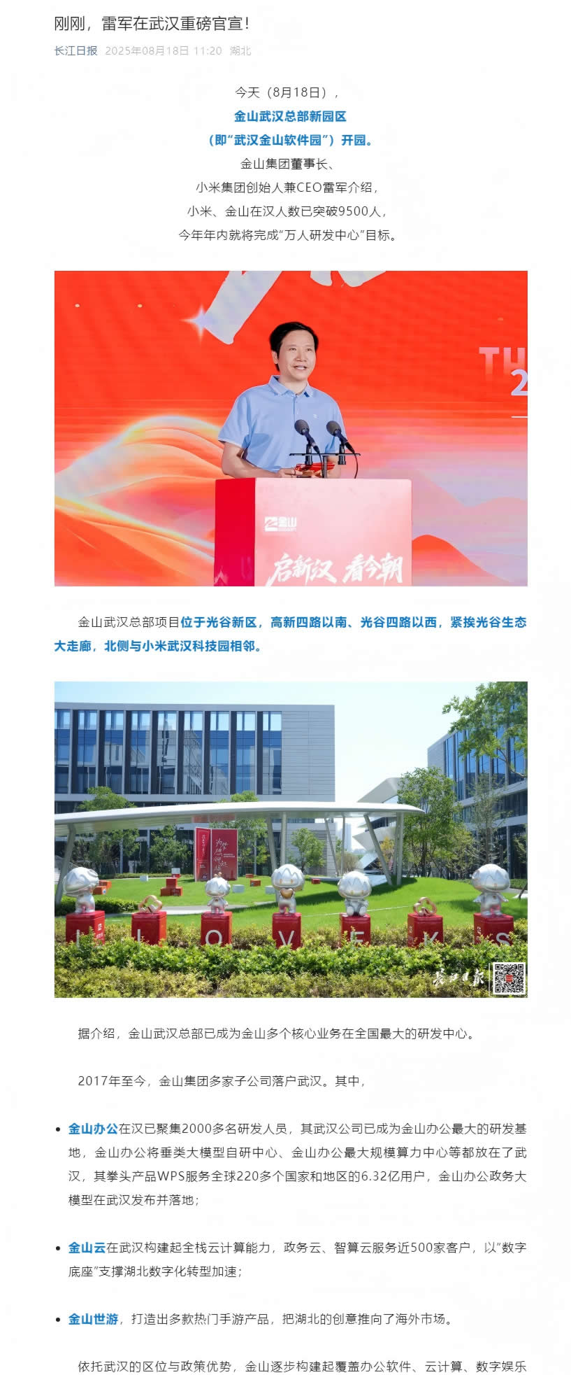 雷军揭幕的金山武汉总部园区里,竟然藏着我们蓝天学子的创意!2025年8月18日,金山武汉总部(武汉金山软件园)开园仪式超吸睛——金山集团董事长、小米集团创始人兼CEO雷军亲自为园区揭幕。这座承载金山多个核心业务的全国最大研发中心,一亮相就备受关注。