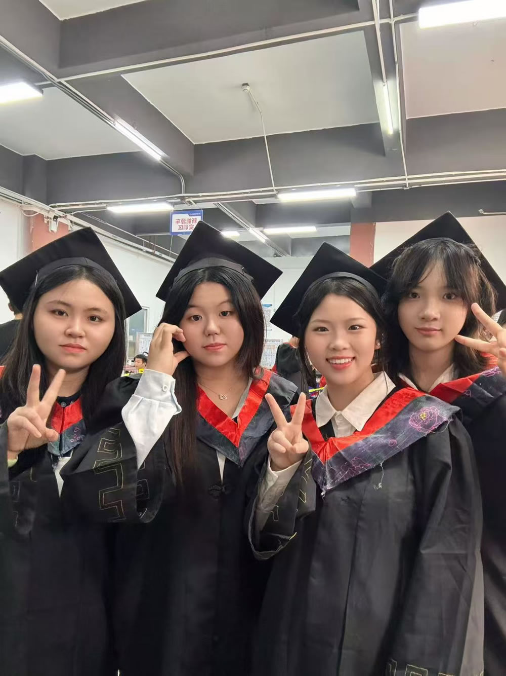 辅导员们赶紧招呼大家避雨,可不少同学反倒来了兴致:有人抛起学位帽,任雨水打湿衣裳。有人三五成群摆着创意姿势,手机快门声不停。“两年的校园生活,本来就是也有风雨也有晴,这场雨刚好教我们笑着面对未来!”形象设计专业的女生擦着脸上的雨水,眼里闪着光。半小时后雨势渐小,摄影师抓紧窗口期喊大家归位,“三二一,茄子!”积水倒映着一张张青春的脸,定格成最诗意的瞬间。
