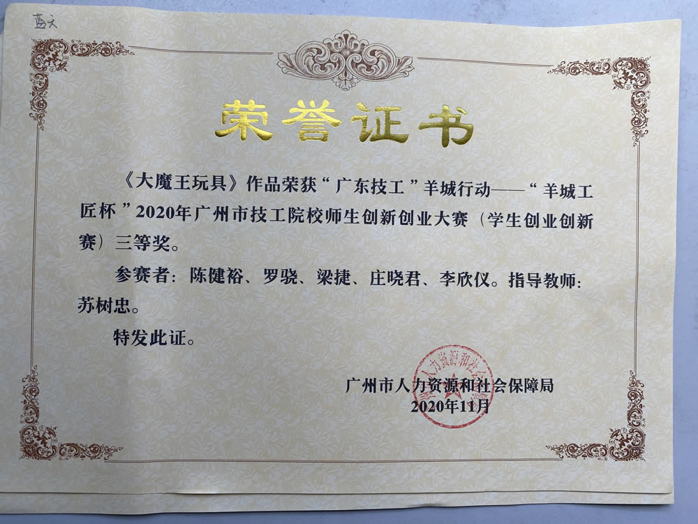 11月9日,由广州市人力资源和社会保障局、广州市总工会联合主办,广州市职业技术教研室承办的“广东技工”羊城行动——“羊城工匠杯”2020年广州市技工院校师生创新创业大赛总结会在广州市机电技师学院隆重举行。广州市蓝天高级技工学校喜获佳绩:学校被评为“优秀组织单位”称号; 《大魔王玩具》等4个参赛作品分别获得创业创新大赛三等奖和优胜奖;苏树忠、赖婧两名老师被授予大赛组织先进个人。
