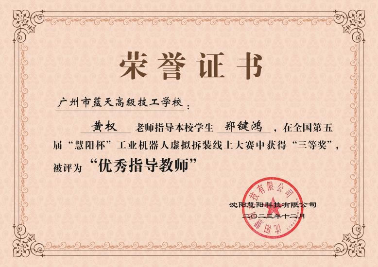 近日,全国第五届“慧阳杯”工业机器人虚拟拆装线上大赛圆满闭幕。广州市蓝天高级技工学校工业机器人专业的谢方大、刘梓昊、郑健鸿三位学子,凭借精湛的技术和稳定的发挥,荣获全国三等奖。同时,他们的指导老师何佳、林健力、黄权也因出色的指导能力被评为优秀指导教师。