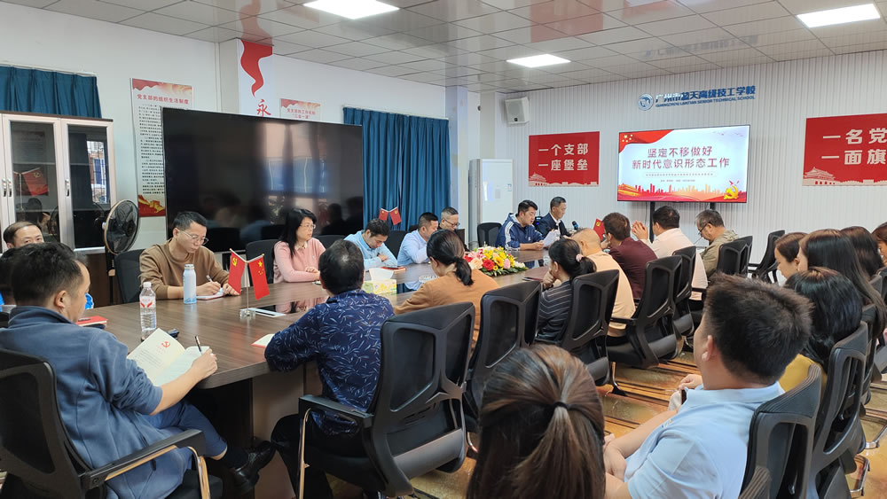 10月20日,广州市蓝天高级技工学校党总支在党员活动室开展“坚定不移做好新时代意识形态工作”专题党课活动,学校各部门负责人、全体党员及入党积极分子参与学习。党总支书记罗来柏主讲。