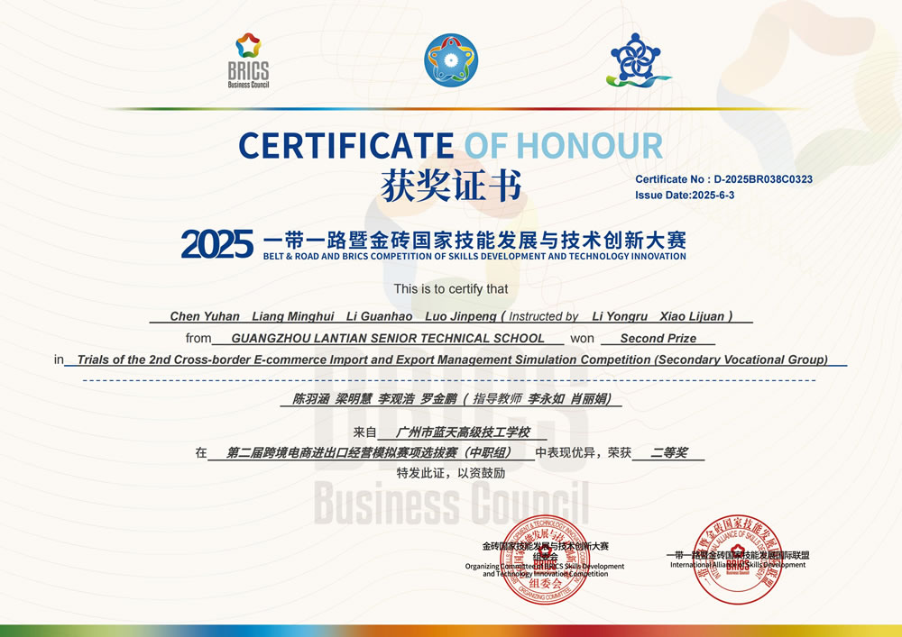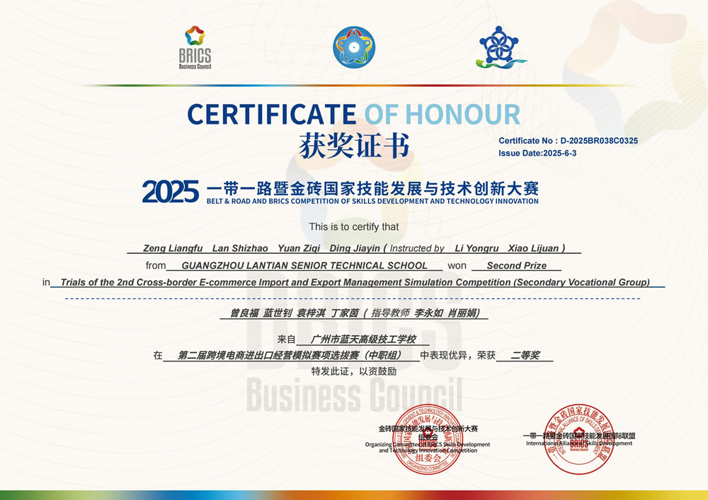 近日,2025“一带一路暨金砖国家技能发展与技术创新大赛”第二届跨境电商进出口经营模拟赛项选拔赛落下帷幕。广州市蓝天高级技工学校电子商务产业系两支参赛团队,突破全国众多职业院校强手重围,双双斩获中职组二等奖,其中,陈羽涵同学带领的队伍更成功晋级国赛!