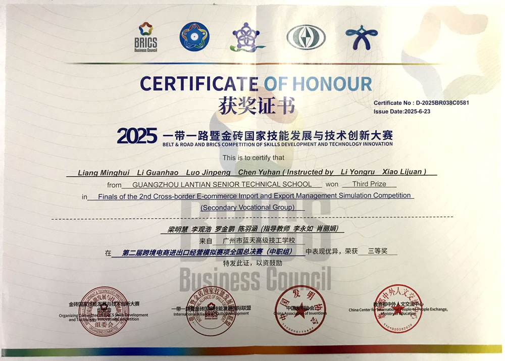 近日,2025“一带一路”暨金砖国家技能发展与技术创新大赛之第二届跨境电子商务进出口经营模拟赛项全国总决赛圆满落幕。广州市蓝天高级技工学校电子商务产业系陈羽涵等四位学子,凭借扎实专业素养、默契团队协作与出色临场发挥,从全国顶尖强队中脱颖而出,斩获全国总决赛三等奖,为学校再添国赛荣誉!