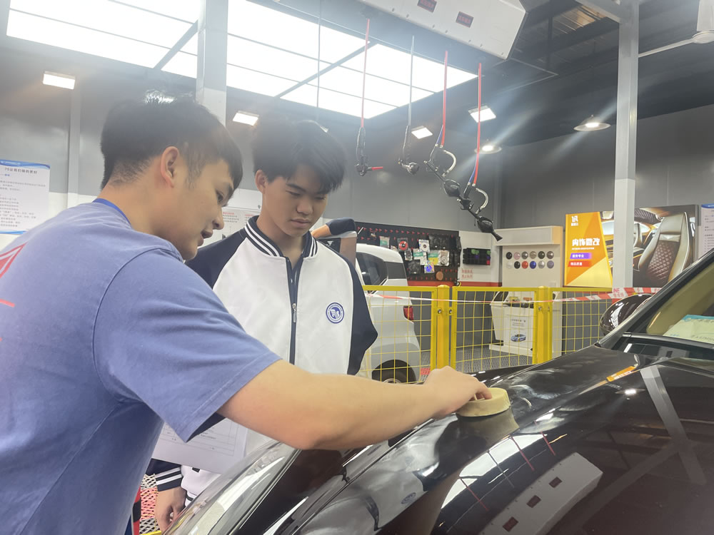 标准定了,怎么教?专业教师将行业规范融入日常教学,把实训课堂变成“毫米级”精度考场:无论是车漆抛光时的转速控制,还是内饰清洁时对缝隙的处理;无论是贴膜时角度的精准校准,还是打蜡时均匀度的精细调控,每个环节都有严格的标准。老师们手把手地教,把技术要点一一拆解开,学生们拿着专业工具,俯身在实训车辆旁一遍遍地重复操作,打磨手感,积累经验。这些看似严苛的要求,正是职业技能教育“以技立身”的生动体现。在这样反复的实操中,学生们把“精准把控、精益求精”的职业素养融入每一个动作,这种在毫米之间较真的实训模式,不仅让他们掌握了核心技能,更培养了严谨细致的职业态度,为未来投身行业筑牢根基。