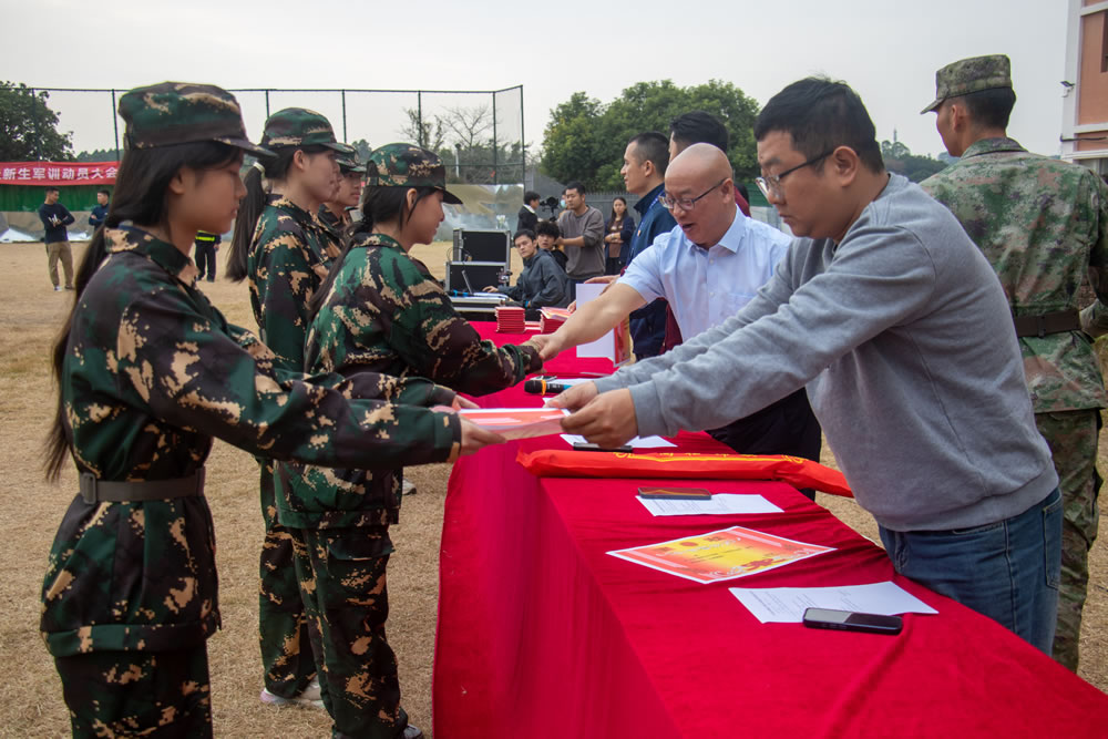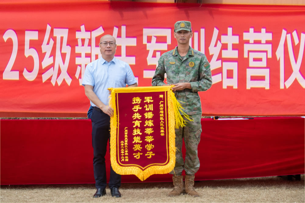 汇演结束后,丁海洋常务副校长代表学校向承训的增城区人民武装部教官团队赠送锦旗,对全体教官的辛勤付出与严格教导表示衷心感谢。
