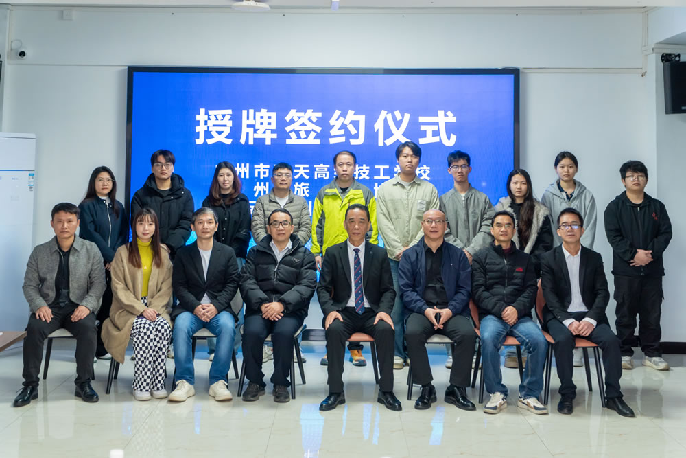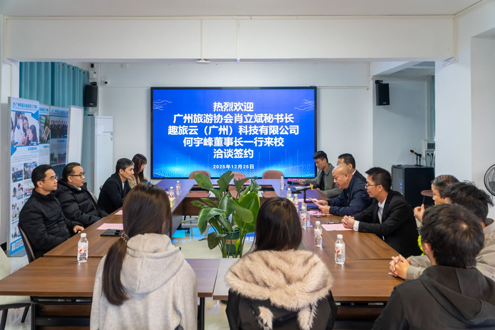 12月25日,广州蓝天高级技工学校与广州旅游协会、趣旅云(广州)科技有限公司的校、企、协三方签约授牌仪式在蓝天高技隆重举行。广州旅游协会秘书长肖立斌、全媒体营销分会副会长杨瑞安、趣旅云科技董事长何宇峰、助理陈仲珊,蓝天高技校长魏跃进、常务副校长丁海洋、就业服务中心主任周泽明、电子商务产业系主任陈伟文,以及相关专业教师和学生代表,共同见证这一重要时刻。这也标志着一场围绕新媒体运营人才培养、助力文旅产业升级的深度合作,就此启航。