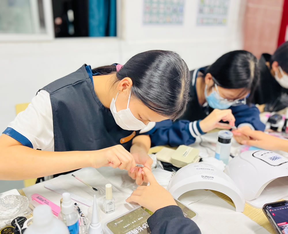 当指尖遇上色彩,当创意碰撞美好,所有的不开心都将被温柔化解!为让校园生活更具温度,让形象设计专业学子在实践中锤炼技能、传递美好,近日,广州市蓝天高级技工学校现代服务系形象设计专业特推出“开心美甲——治愈你的不开心”美甲体验营活动,用精致指尖艺术,为师生们送上一份专属治愈力。