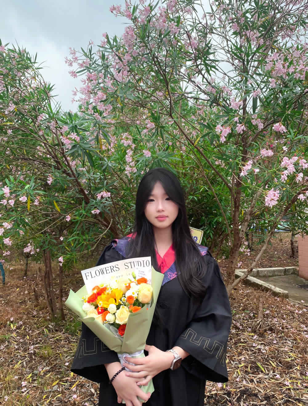 辅导员们赶紧招呼大家避雨,可不少同学反倒来了兴致:有人抛起学位帽,任雨水打湿衣裳。有人三五成群摆着创意姿势,手机快门声不停。“两年的校园生活,本来就是也有风雨也有晴,这场雨刚好教我们笑着面对未来!”形象设计专业的女生擦着脸上的雨水,眼里闪着光。半小时后雨势渐小,摄影师抓紧窗口期喊大家归位,“三二一,茄子!”积水倒映着一张张青春的脸,定格成最诗意的瞬间。